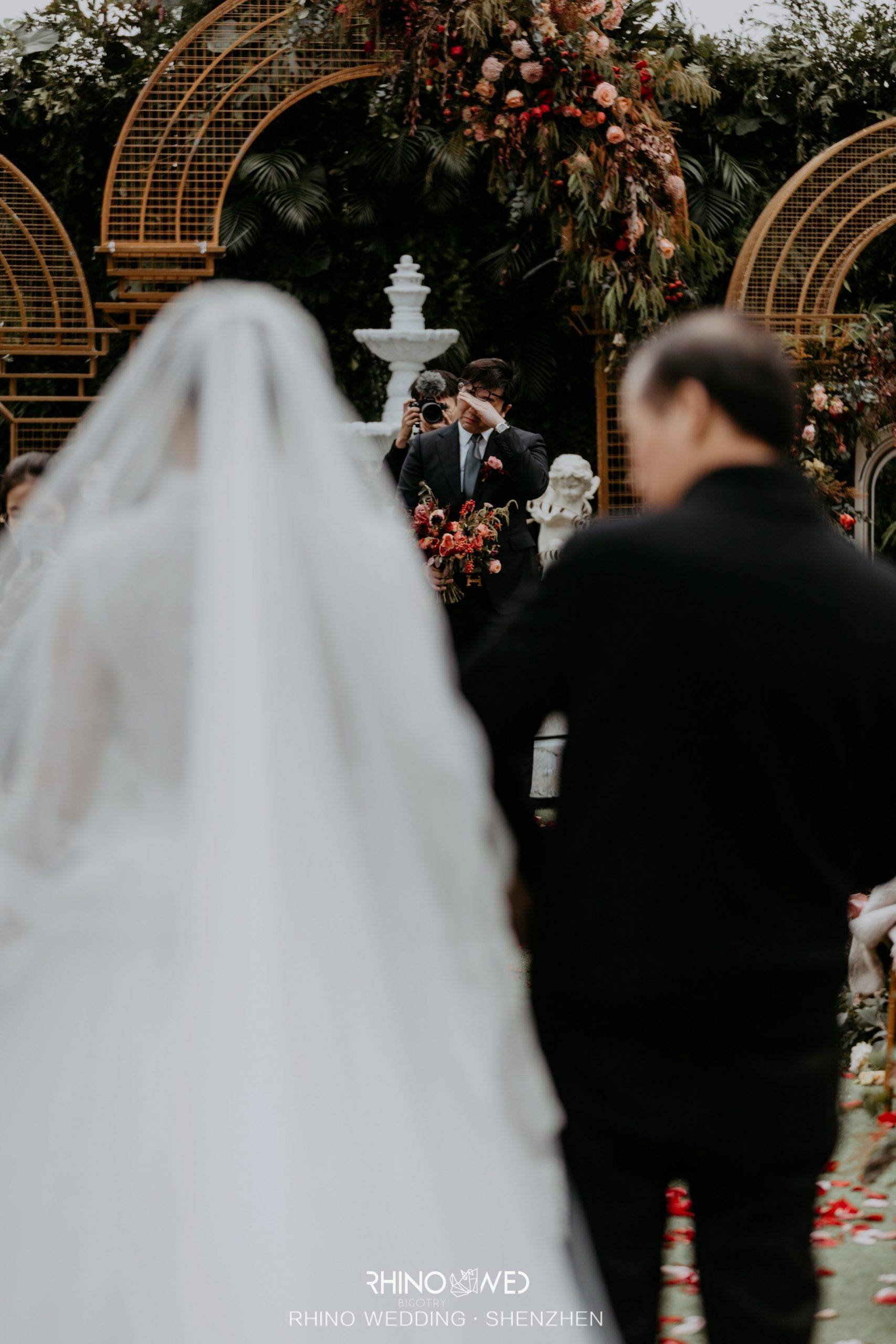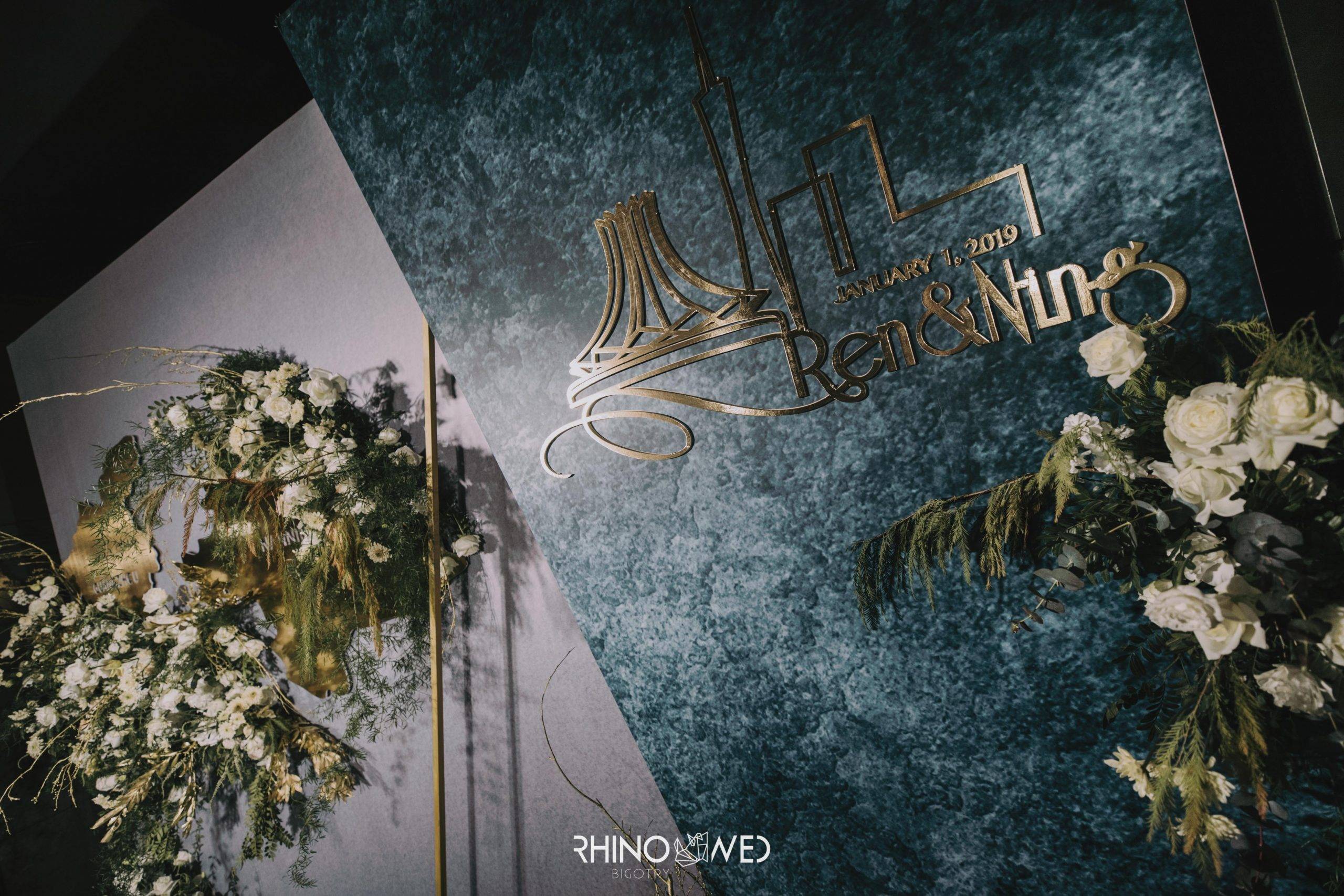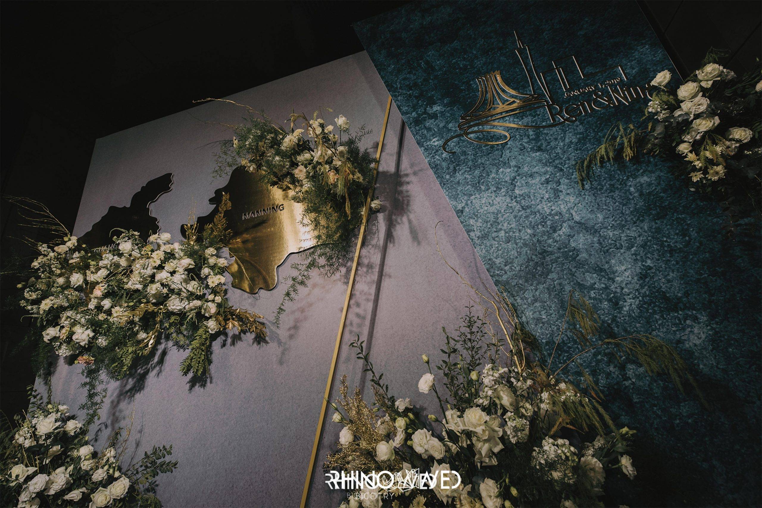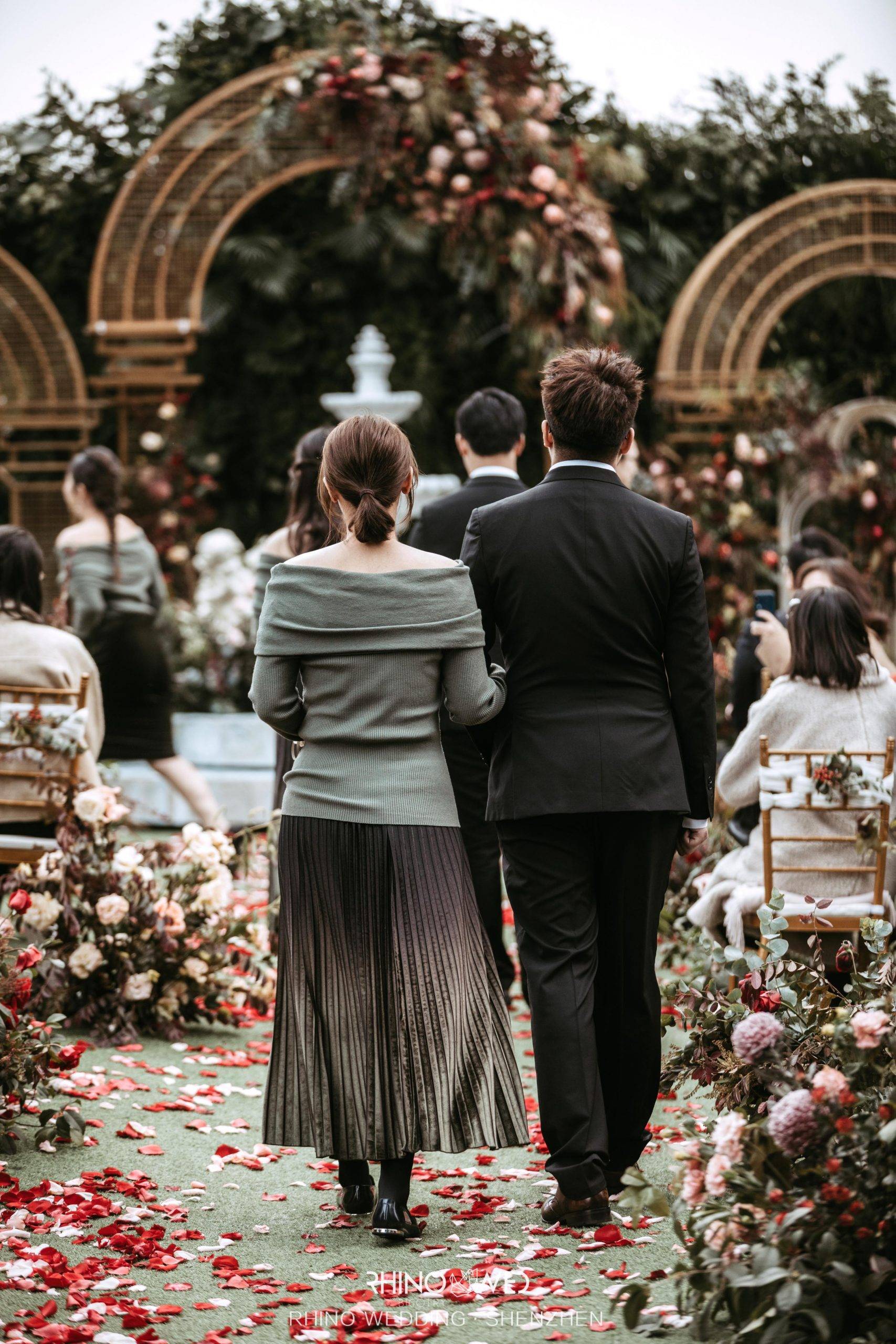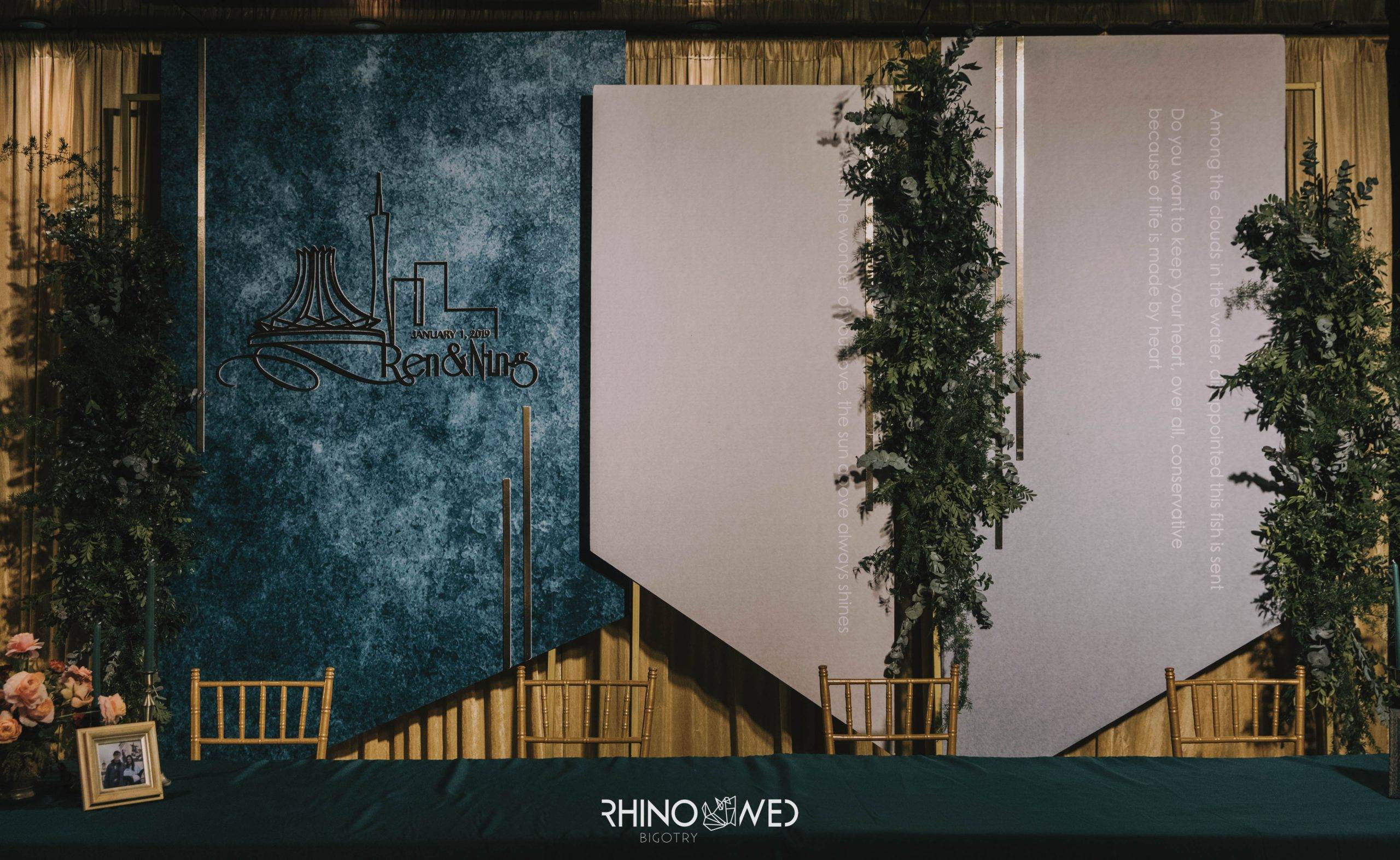 结合新娘喜好的复古风格、墨绿色酒红色户外婚礼氛围的主色调,我们延伸了当中的墨绿色将其运用在室内的氛围设计中,选择了石头纹路底纹和材质的金属质感,来映衬新郎的刚性。一场庄重的户外婚礼仪式、一场温馨的百人至亲家宴,在新年的第一天里,美满至极。