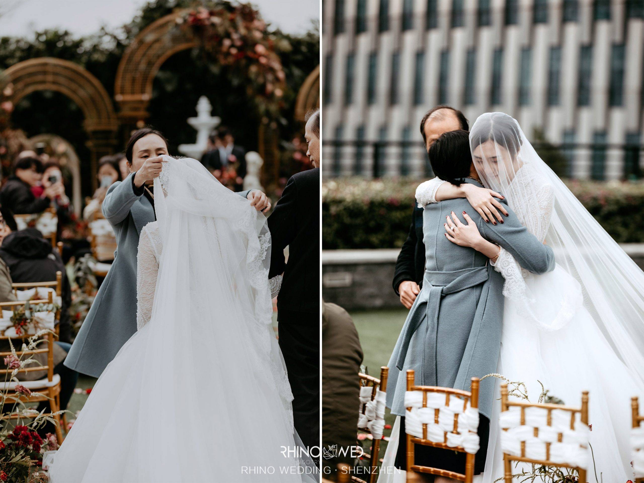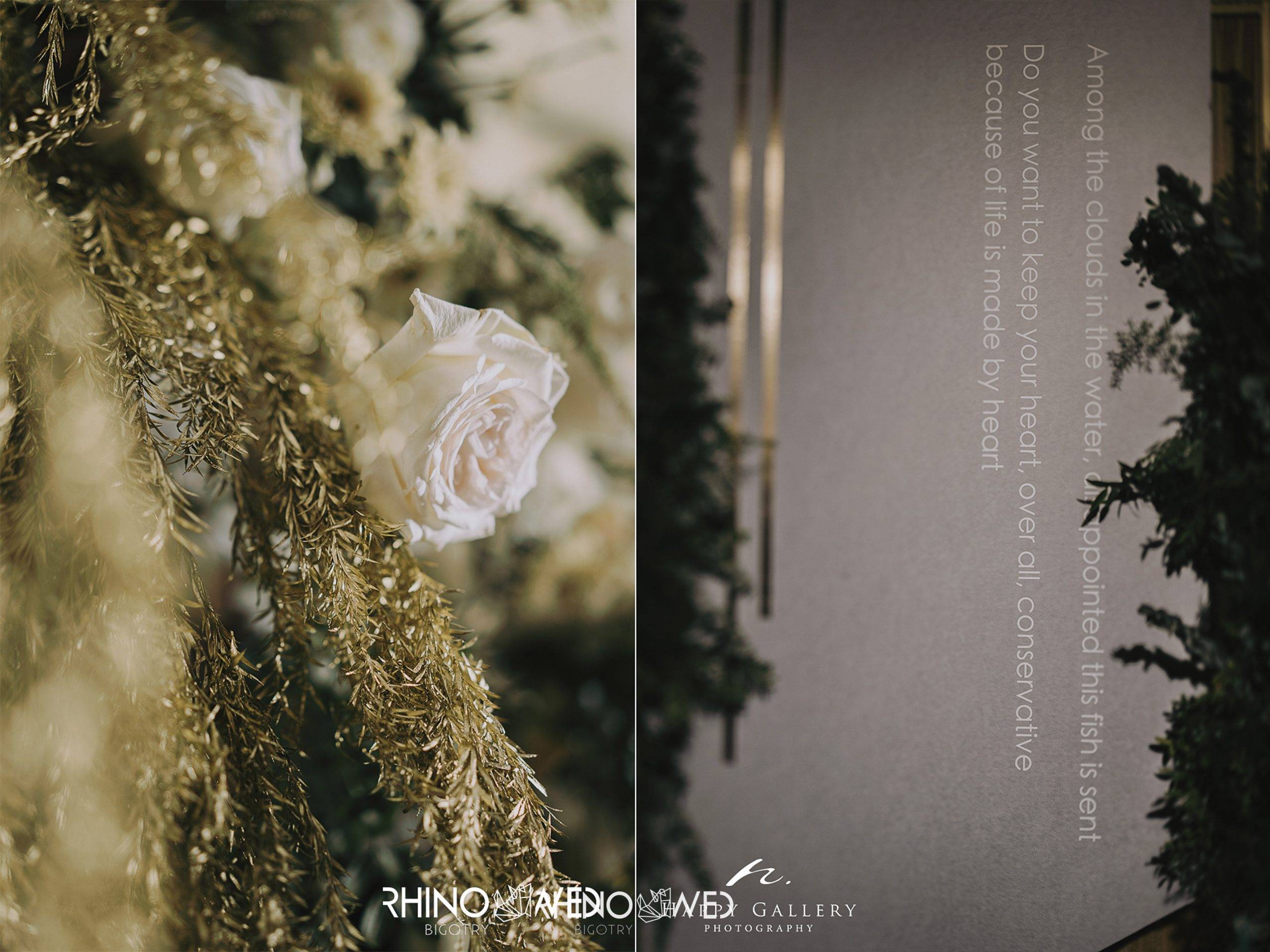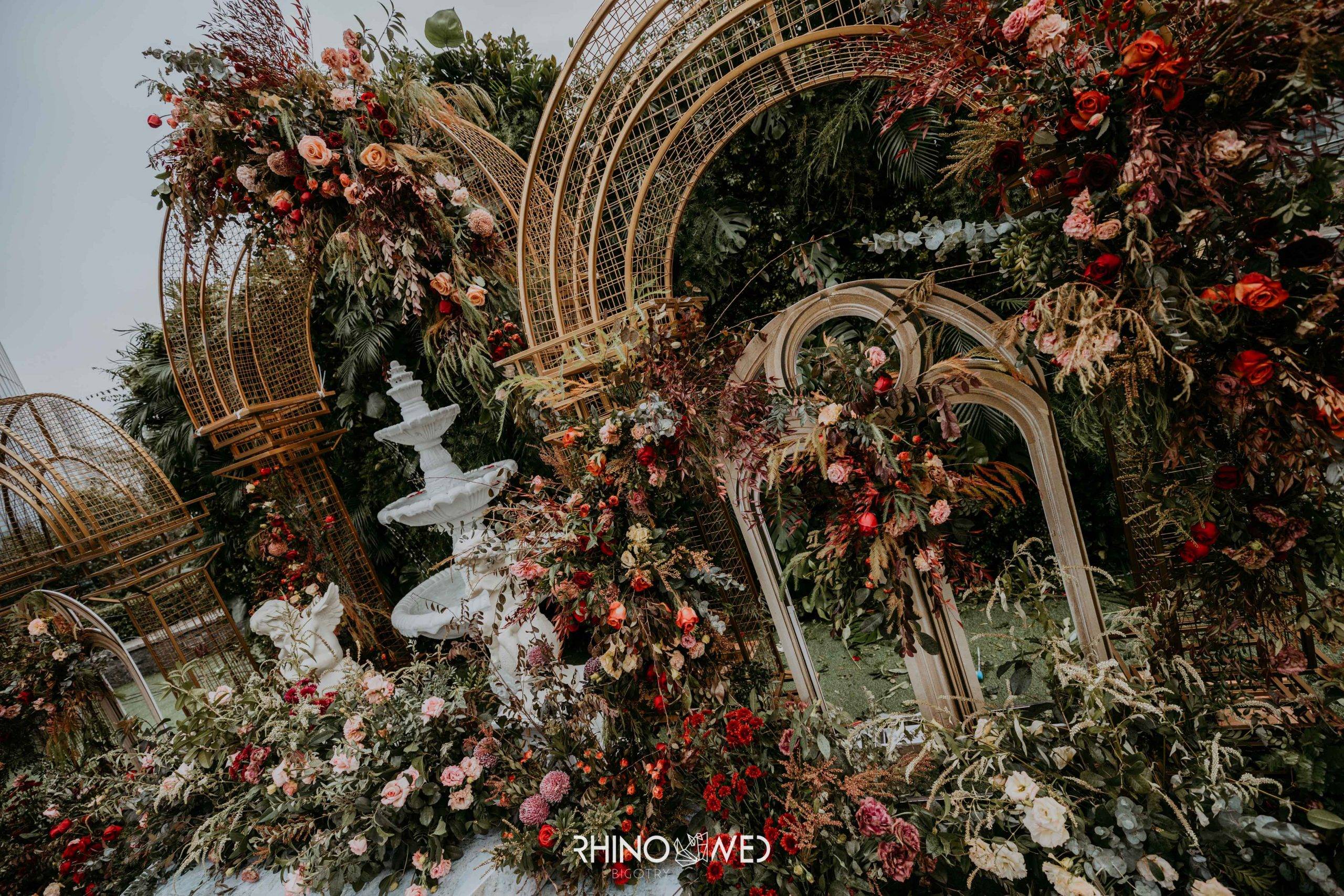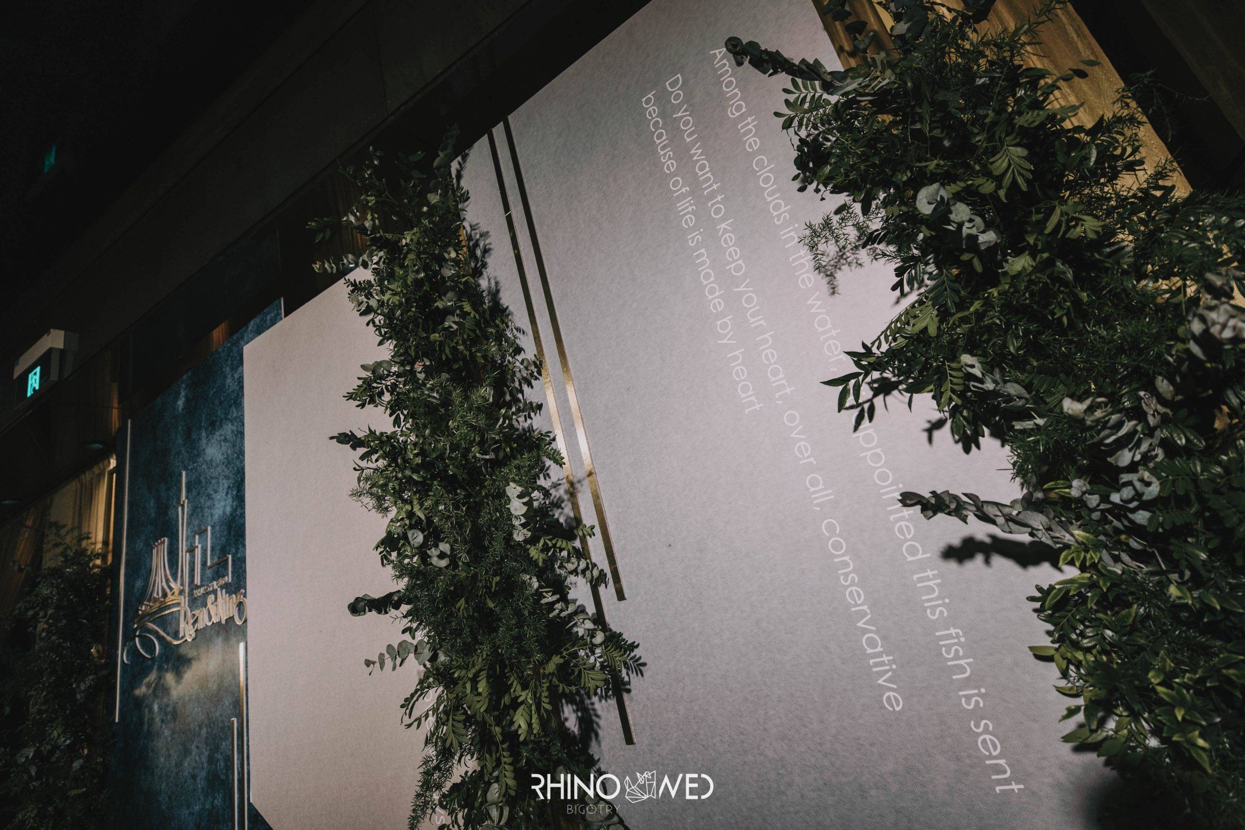 结合新娘喜好的复古风格、墨绿色酒红色户外婚礼氛围的主色调,我们延伸了当中的墨绿色将其运用在室内的氛围设计中,选择了石头纹路底纹和材质的金属质感,来映衬新郎的刚性。一场庄重的户外婚礼仪式、一场温馨的百人至亲家宴,在新年的第一天里,美满至极。