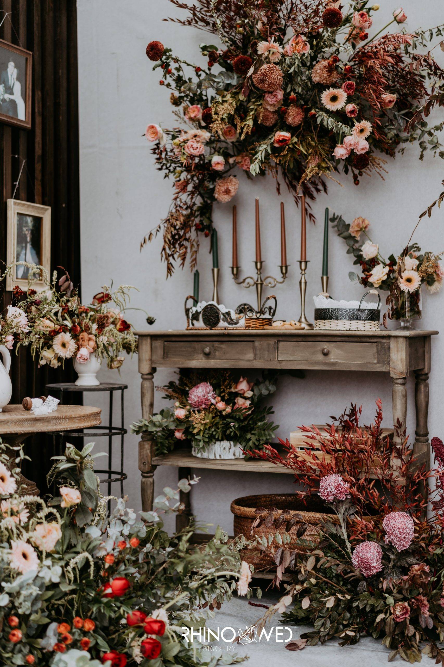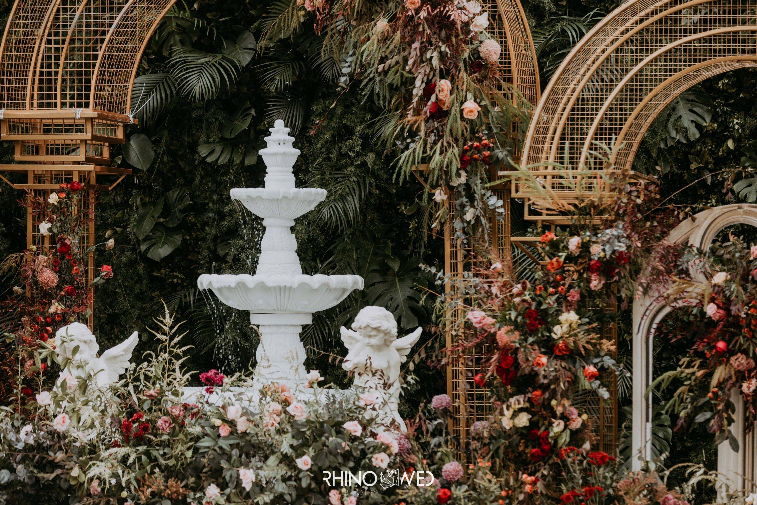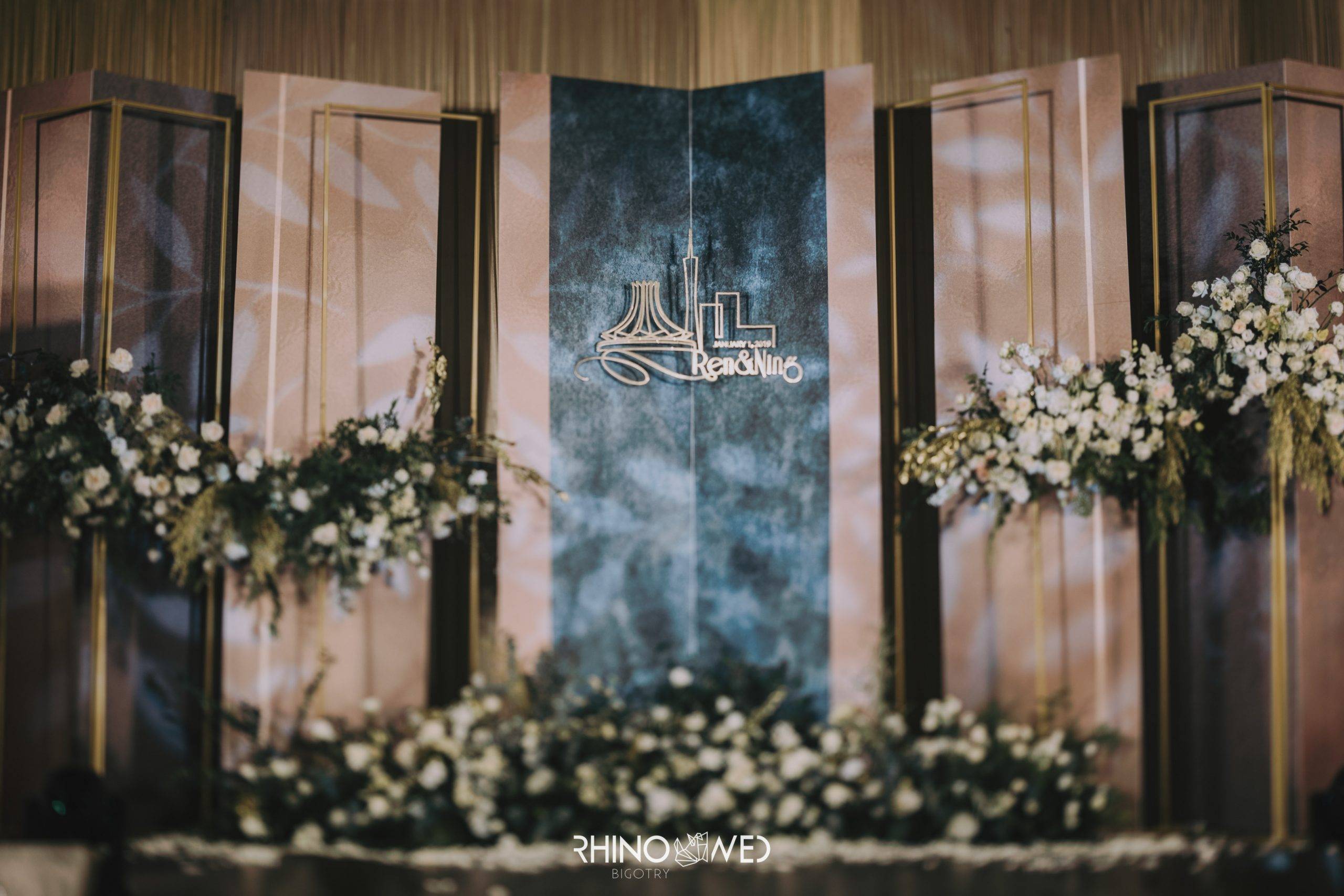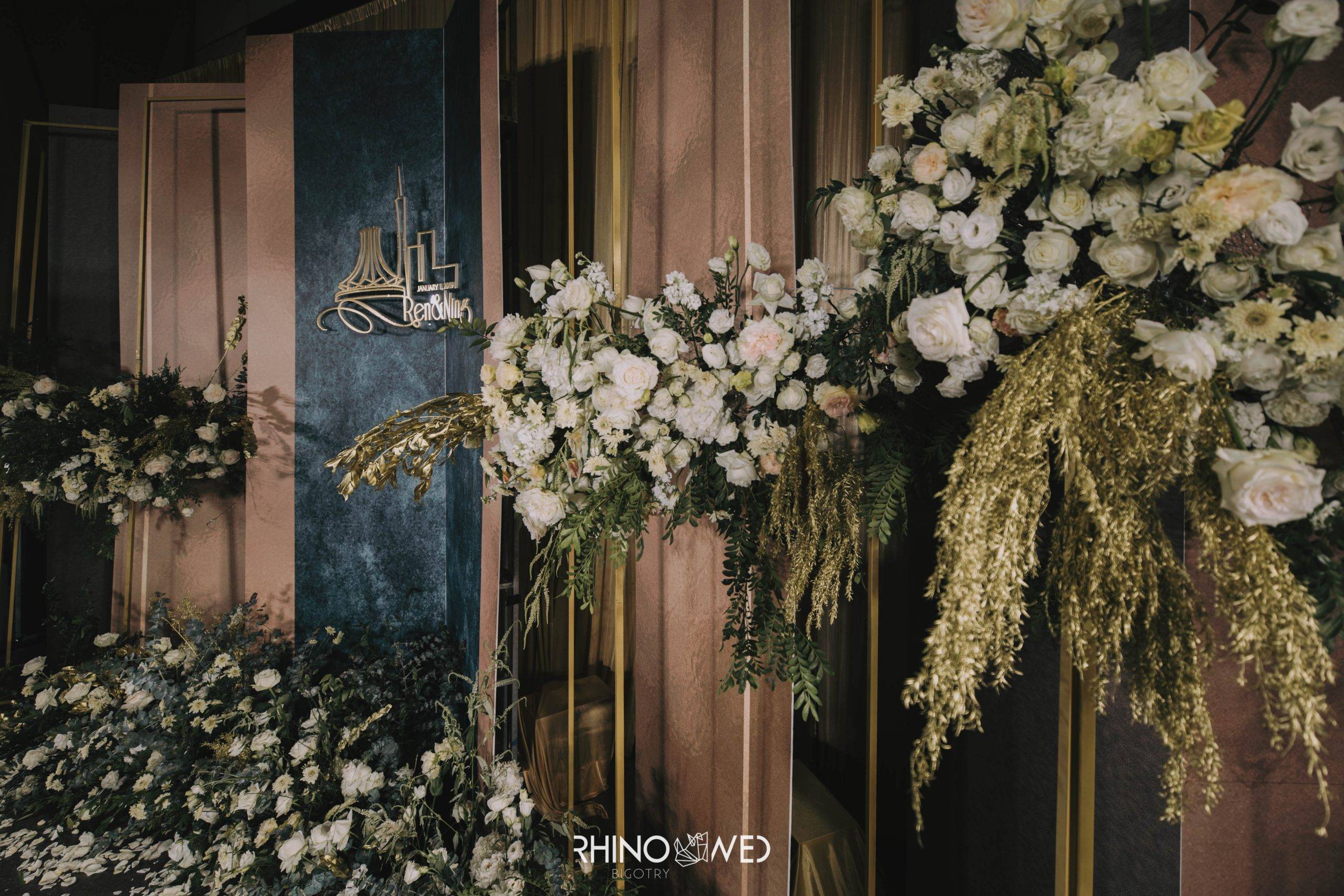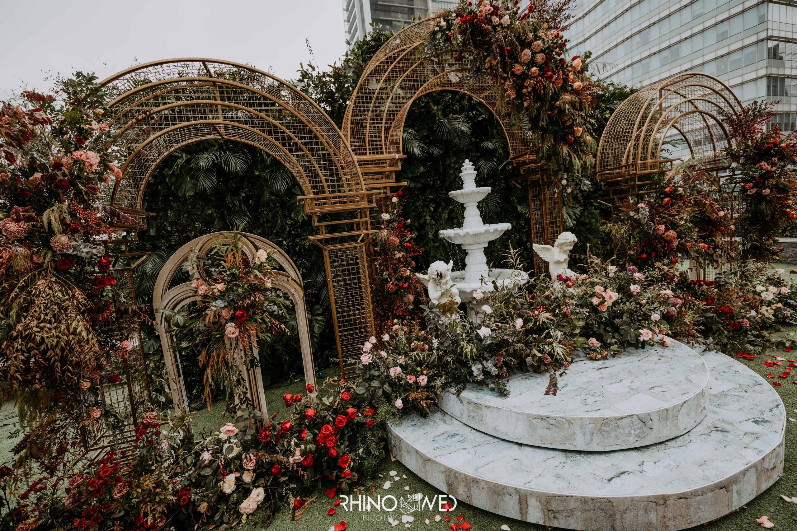 结合新娘喜好的复古风格、墨绿色酒红色户外婚礼氛围的主色调,我们延伸了当中的墨绿色将其运用在室内的氛围设计中,选择了石头纹路底纹和材质的金属质感,来映衬新郎的刚性。一场庄重的户外婚礼仪式、一场温馨的百人至亲家宴,在新年的第一天里,美满至极。